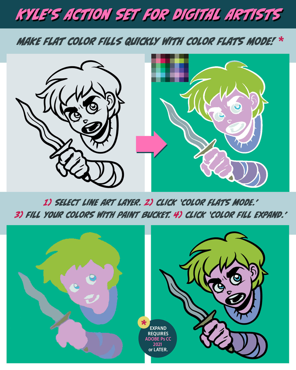 Note: my color flatting/color expand action works quite well for simple line art, and even some mildly complex line art, but gaps must be closed for good results. For the gold standard plugin for color flatting in Photoshop, check out B Pelt's brilliant plugin – I highly recommend it for comics professionals. Find it here: https://peltmade.com/psplugins-flatting.html